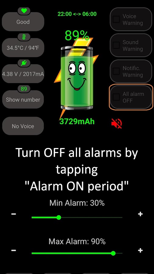 В приложении Сигнализация батареи нет рекламы, он не ворует данные с телефона, не использует интернет, не использует критически важные лицензии Android, GPS, GSM …
