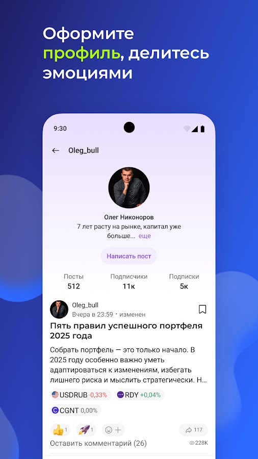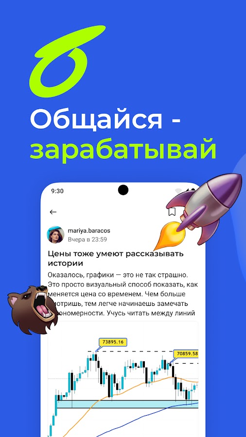 В приложении есть сообщества, деловые клубы и каналы для обсуждения про инвестиции, вопросов типа «как стать успешным», «как зарабатывать» или «где зарабатывать». Вы можете вести блог, делиться постами про бизнес и финансы, оформлять публикации, запостить свой контент или создать полноценный блог про деньги.