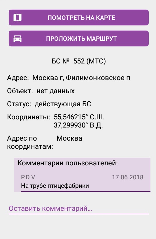 Совместная работа: делитесь координатами БС с коллегами и оставляйте комментарии.