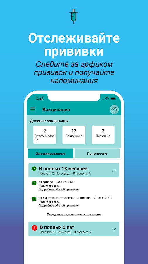 • Календарь прививок и журнал вакцинаций