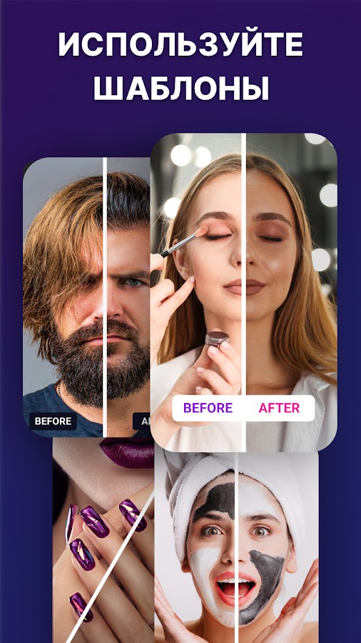Соединить фото и сравнить в приложении очень просто. Нужно выбрать 2 фотографии из галереи и произойдет склейка фото в видео. Попробуйте разные анимации ползунка, проведите сравнение двух фоток. Затем соединение фото произойдет автоматически. Это лучшая бефоре афтер программа для создания видео из фото.