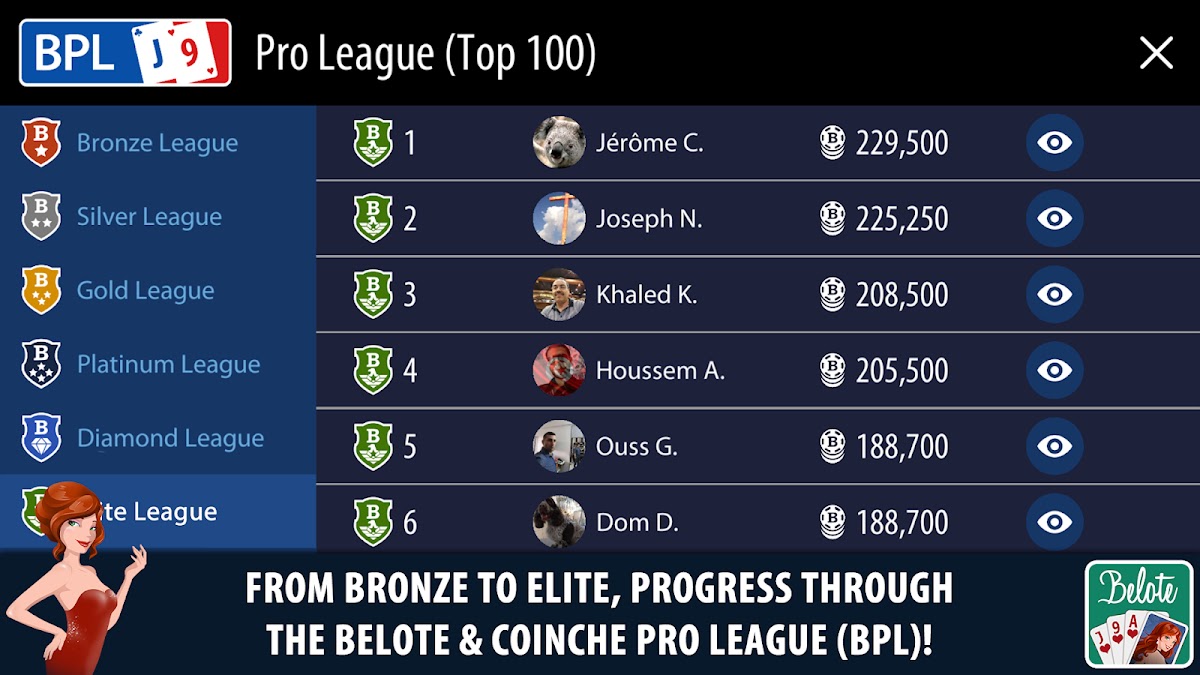 Belote & Coinche Pro League (BPL) контролирует все события и турниры в Belote & Coinche Multiplayer; 6 лиг (от бронзовой до элитной), Belote Tours (Франция или Мастерс) и турниры Большого шлема.
