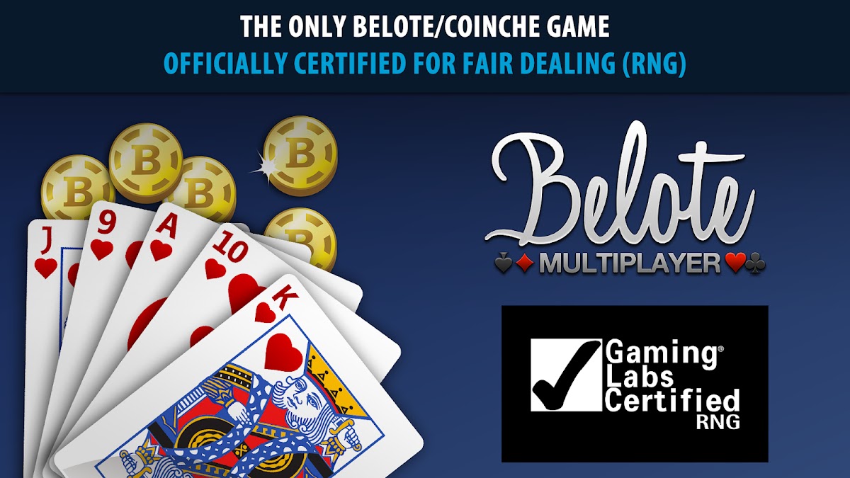 Belote & Coinche Multiplayer — единственная игра Belote/Coinche, официально сертифицированная как генератор случайных чисел (RNG) Gaming Laboratories International, LLC (ведущая в мире независимая лаборатория тестирования, инспекции и сертификации в игровой индустрии), что гарантирует подлинный опыт со случайной последовательностью раздачи карт.