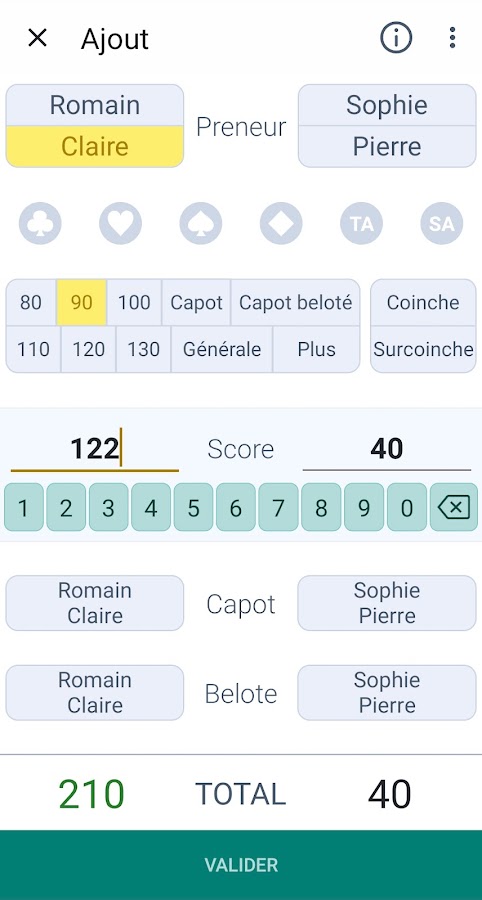 Belote Score — это приложение, которое позволяет вам просто управлять счетами во время игр в белот и коинч (ОБРАТИТЕ ВНИМАНИЕ: это приложение представляет собой счетчик, а не игру).