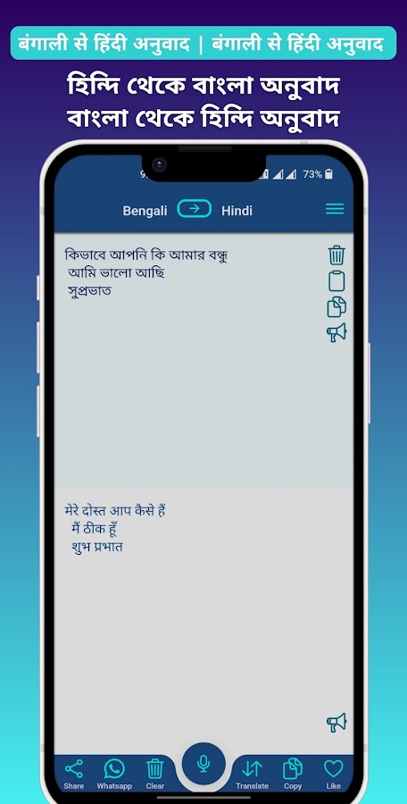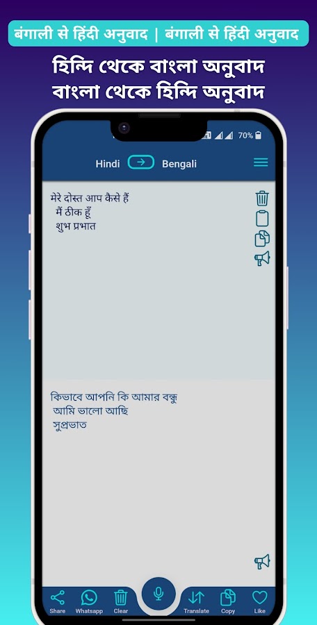 С помощью этого классного приложения вы можете печатать на бенгали и переводить бенгальский на хинди. Это приложение предоставляет функцию произношения для прослушивания переведенного текста на разной высоте, чтобы вы могли четко понимать произносимые слова. Вы можете очень легко скопировать и поделиться переведенным текстом в любом приложении для обмена сообщениями, чата или социальных сетей.