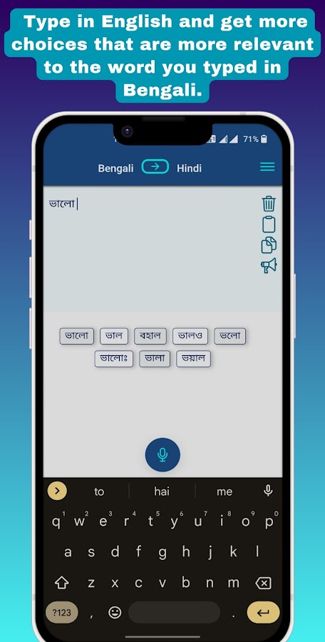 Приложение сделает ввод текста на хинди естественным. Когда вы вводите английский символ, он автоматически переводится на алфавиты хинди. Когда вы нажмете пробел, в нижней части экрана появится больше слов, содержащих больше вариантов, соответствующих только что набранному вами слову. Вы можете печатать на хинди английскими буквами так, как вы на нем говорите. Как только вы закончите печатать на хинди, вы можете использовать кнопку перевода внизу, чтобы перевести тексты с хинди на бангла.