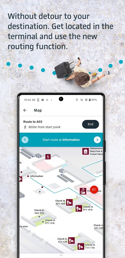 • Просматривайте свое местоположение в терминале и пешеходный маршрут до желаемого пункта назначения на карте.