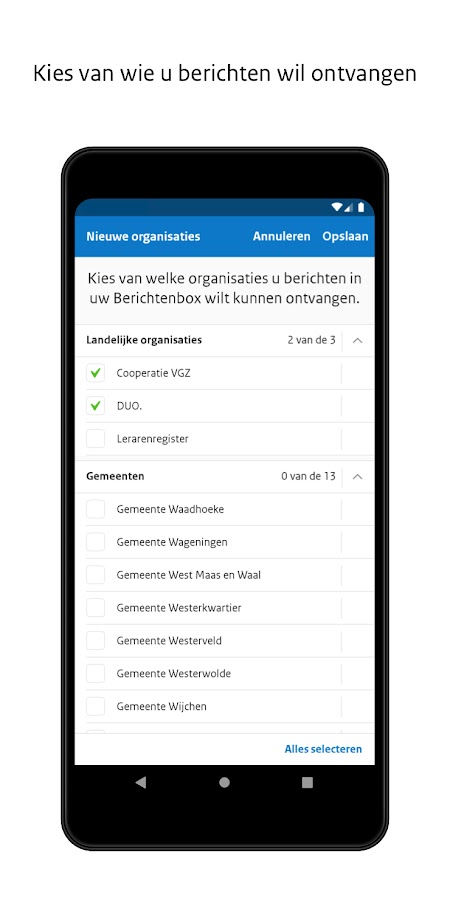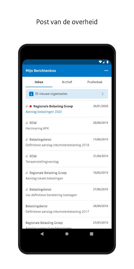 С помощью приложения у вас есть доступ к папкам с входящими сообщениями, архиву и корзине сообщений в MyGo Government. Вы можете читать и перемещать сообщения в архив или корзину. Если сообщение имеет вложение, вы можете переслать его, сохранить или открыть в другом приложении. В приложении вы можете видеть, какие новые организации начали использовать окно сообщений, и вы можете указать, разрешено ли этим организациям отправлять вам электронную почту. В настоящее время пока невозможно изменить ваши предпочтения для организаций, которые уже являются аффилированными. Вы можете войти в это на сайте mijn.overheid.nl.