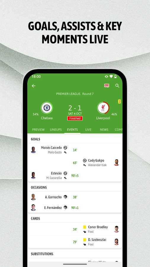 Получайте персонализированные уведомления о голах, составах команд, статистике личных встреч, трансферах, матчах в прямом эфире и многом другом!