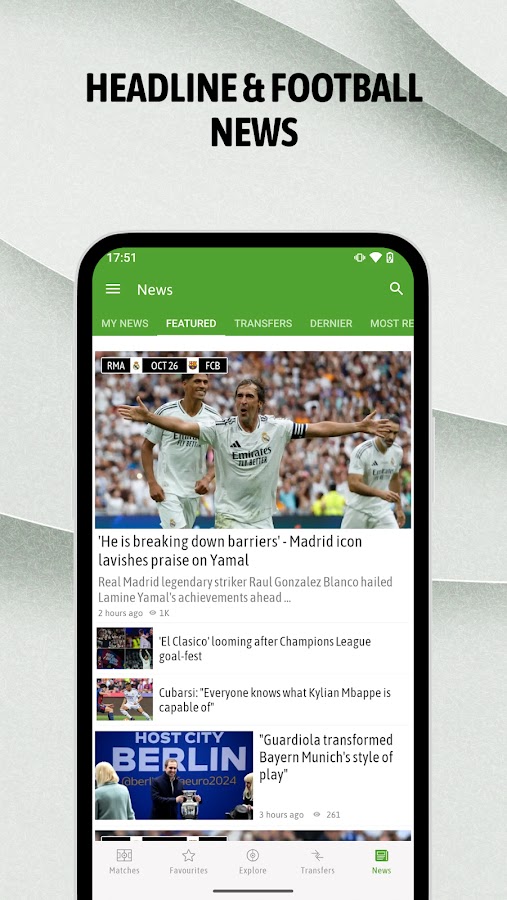 – Последние обновления по игрокам, соревнованиям, лучшим командам и трансферному рынку