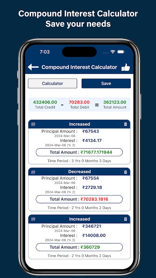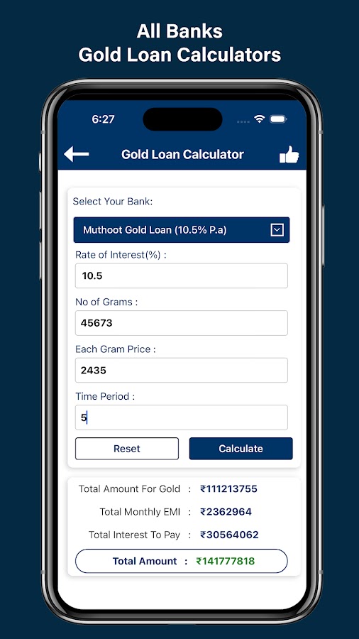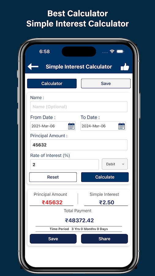 Представляем наше приложение Best Calc Financial Calculator, комплексный и простой в использовании инструмент, предназначенный для удовлетворения всех ваших финансовых и инвестиционных потребностей. Наше приложение Financial Calculator India поможет вам: от планирования кредита до управления сбережениями и расчета доходности инвестиций. Благодаря широкому выбору специализированных индийских калькуляторов вы можете обрабатывать все: от золотых ссуд и ипотечных кредитов до процентных ставок FD и государственных схем, и все это в одном месте.