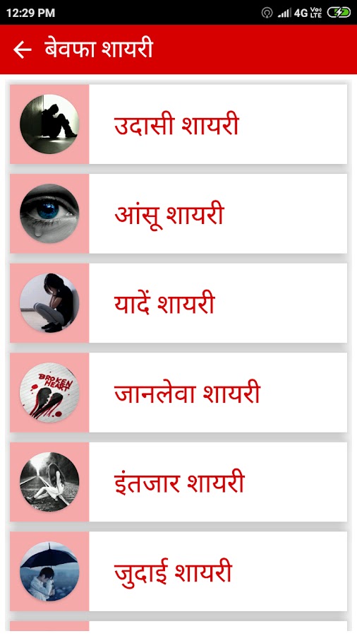 Приложение имеет хорошую коллекцию Judai Shayari и Dard Shayari, а также грустную Shayari.