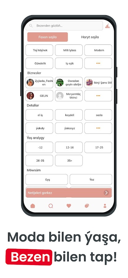 Bezen – bezenesi gelýän zenanlara öz halaýan fasonlaryny (Ýeňillik bilen) tapmak üçin niýetlenendir! Zenanlara iň täze fason trendlerini aňsatlyk bilen gözlemäge, halaýan tikinçilerini yzarlamaga we ýerli moda industriýasyna goşulmaga mümkinçilik berýäris. Biznesler üçin bolsa, öz harytlaryny müşderilere netijeli hödürlemekde, brendlerini öňe çykarmakda we täze bazarlara açylmakda täsirli çözgüt hödürleýäris. Bezen – modanyň we tehnologiýanyň sazlaşygy!