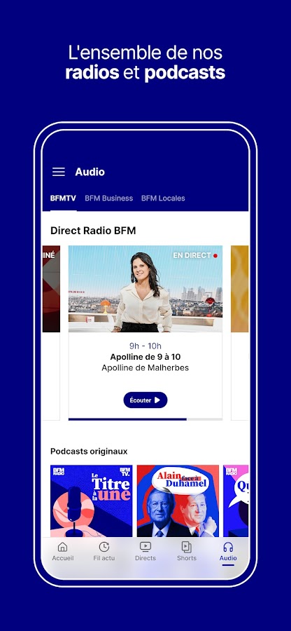 Скачайте бесплатно новое приложение BFM и будьте в курсе всех новостей Франции и мира круглосуточно. Получите доступ к многочисленным политическим, экономическим, культурным, международным, спортивным и социальным новостям в виде видео, статей, подкастов и радиопередач в прямом эфире или по запросу, обновляемым в режиме реального времени. Вы также можете получать местные новости, прогноз погоды и информацию о дорожной обстановке на наших 9 местных каналах.