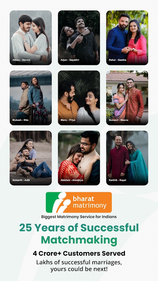 Bharat Matrimony — самый надёжный сервис по регистрации брака для индийцев во всём мире, входящий в группу Matrimony.com. С 2000 года мы помогли сотням тысяч индийских невест и женихов найти свою идеальную дживансати.
