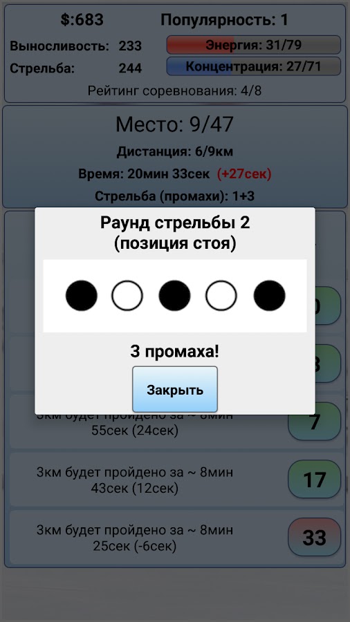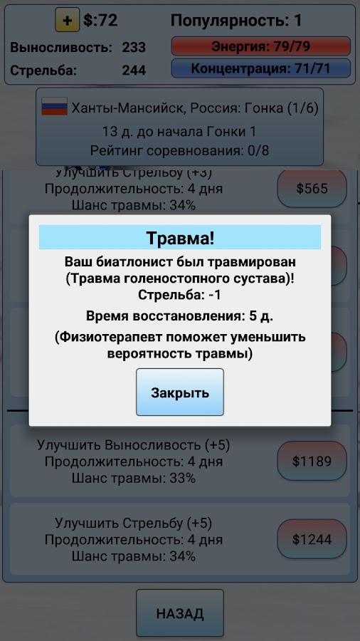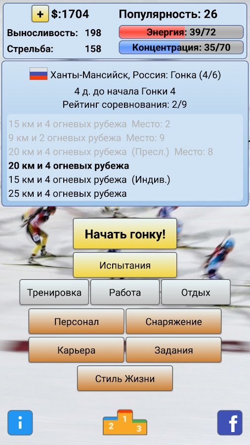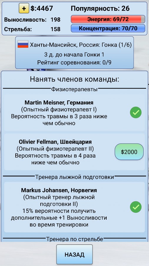 — Разнообразные дополнительные мероприятия (например, отправить биатлониста продавать пиво в бар, чтобы подзаработать или посетить горнолыжный курорт, чтобы отдохнуть перед турниром).