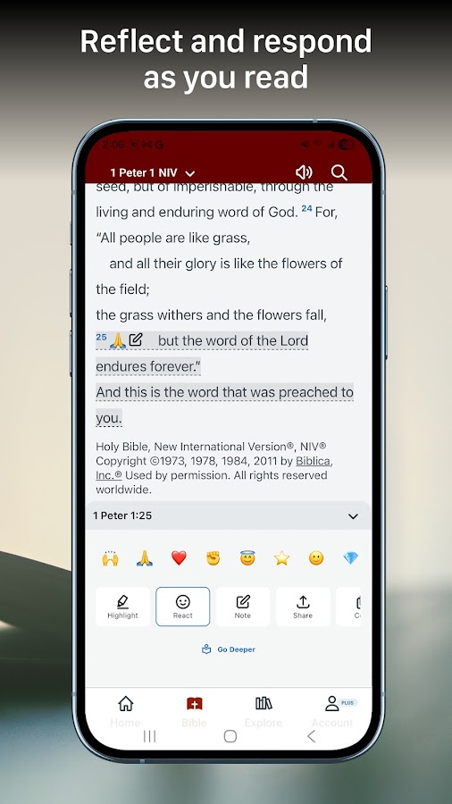 • Выделение текста, создание заметок, ответы на любимые стихи с помощью смайликов и синхронизация между устройствами с помощью бесплатной учетной записи