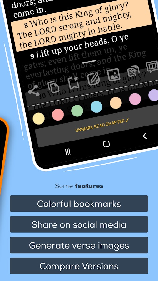 ● Стихи: функции выделения, копирования, закладки и создания собственных цветных маркеров; добавления личных заметок; обмена стихами в социальных сетях; создайте изображения отрывков для обмена; выберите время дня, когда вы хотите получить стих дня.
