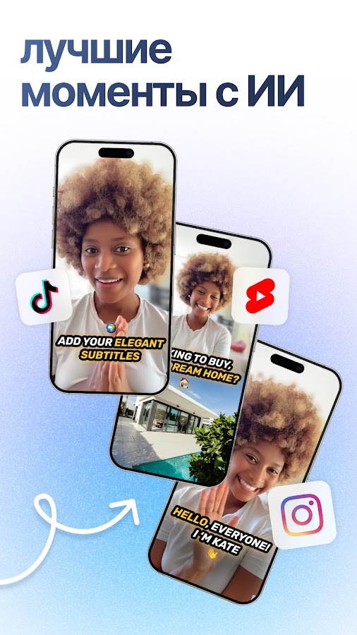 Автоматически изменяйте размер и обрезайте видеоклипы до квадратного, вертикального или горизонтального формата для максимального эффекта на таких платформах, как Instagram (посты, истории и ролики), TikTok и YouTube.