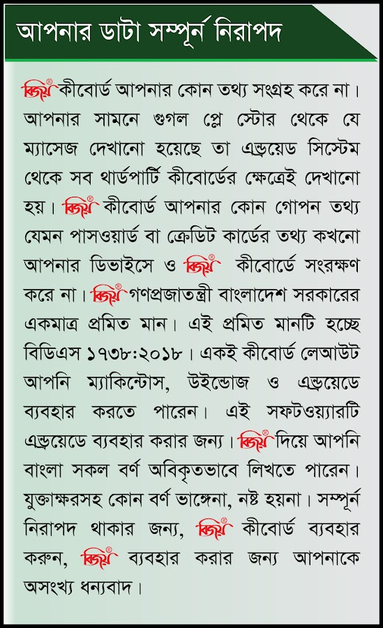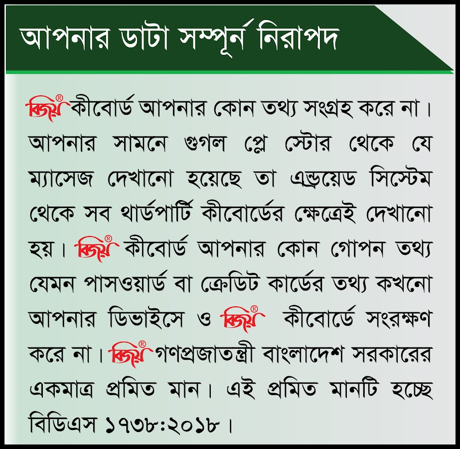বিজয় কীবোর্ড কোন গোপন তথ্য যেমন পাসওয়ার্ড বা ক্রেডিট কার্ডের তথ্য কখনো আপনার ও বিজয় কীবোর্ডে সংরক্ষণ করে না।বিজয় বাংলাদেশ সরকারের একমাত্র প্রমিত মান। এই প্রমিত মানটি হচ্ছে বিডিএস ১৭৩৮:২০১৮ । একই কীবোর্ড আপনি ম্যাকিন্টোস, উইন্ডোজ এন্ড্রয়েডে ব্যবহার ব্যবহার করতে পারেন ।এই এন্ড্রয়েডে ব্যবহার করার ।বিজয় দিয়ে আপনি বাংলা সকল বর্ণ অবিকৃতভাবে লিখতে পারেন। যুক্তাক্ষরসহ কোন ভাঙ্গেনা ভাঙ্গেনা, নষ্ট ।সম্পূর্ন নিরাপদ থাকার জন্য জন্য, বিজয় ব্যবহার করুন করুন, বিজয় করার জন্য আপনাকে অসংখ্য ধন্যবাদ।।।।।