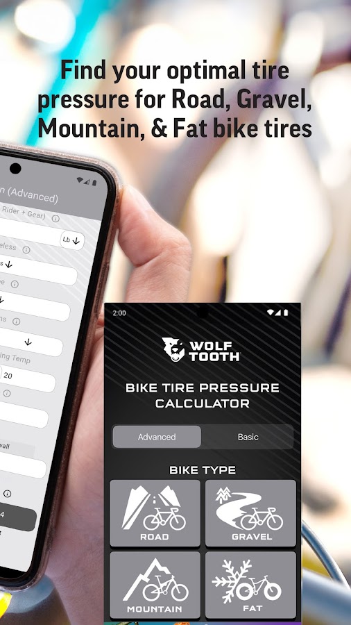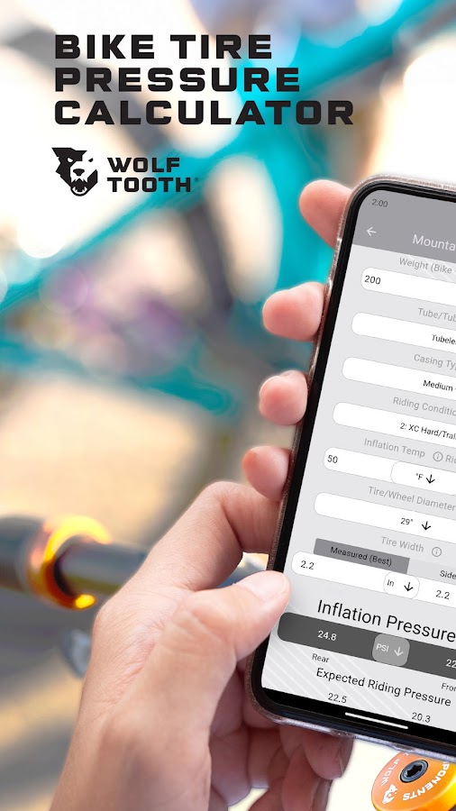 Приложение «Калькулятор давления в шинах велосипеда» на базе Wolf Tooth позволяет велосипедистам найти идеальное давление в шинах в зависимости от местности и условий езды на предстоящем маршруте. Велосипедисты делятся информацией о размере колес, ширине шин, весе водителя, температуре езды и многом другом, чтобы получить конкретные рекомендации по давлению в шинах для гравийных, горных и толстых велосипедов.