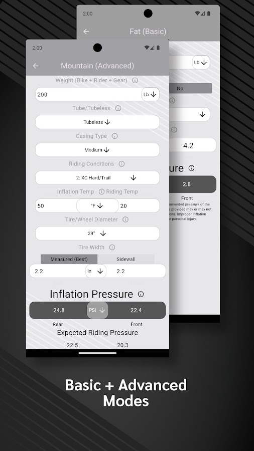 Калькулятор давления в шинах велосипеда имеет два режима для определения идеального давления в шинах. Базовый режим учитывает сокращенные коэффициенты для быстрого определения оптимального давления в шинах, а расширенный режим учитывает несколько факторов для определения идеального давления в шинах для дальнейшей поездки.