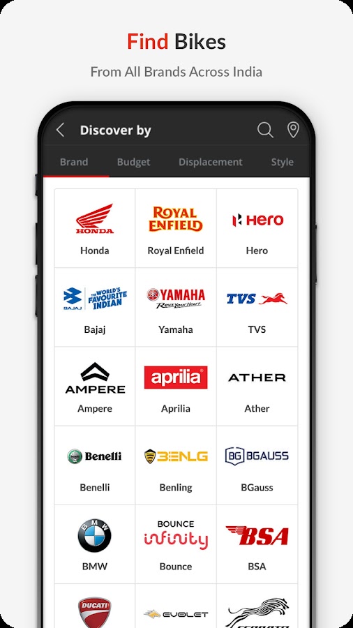 1. Поиск. Просмотрите велосипеды по вашему выбору. В приложении размещаются двухколесные транспортные средства от лучших производителей. Назовем некоторые — Royal Enfield, TVS, Hero, Bajaj, Honda, Yamaha, Suzuki, KTM, Jawa, BMW, Harley-Davidson, Yezdi, Ather, Ducati, Bounce, Okinawa, Moto Morini и многие другие.