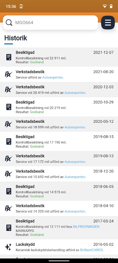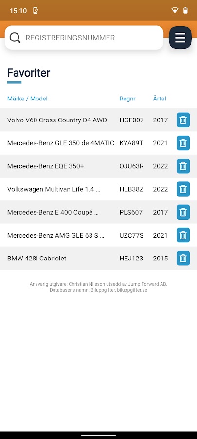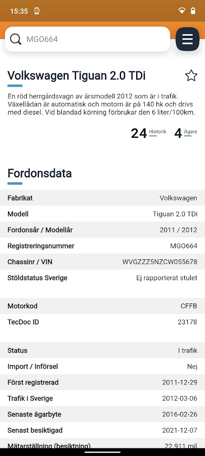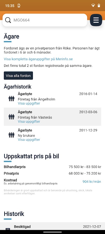 Информация об автомобиле полностью загружена информацией обо всех транспортных средствах в Швеции. Самая полная база данных с указанием владельцев, служебной информации, истории, в т.ч. пробег, оценка автомобиля, долги по транспортному средству и многое другое.