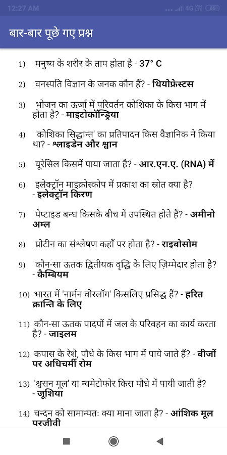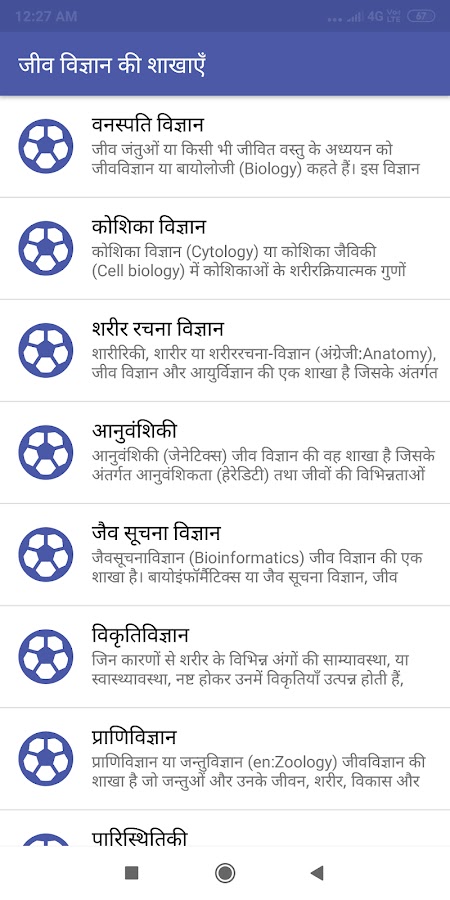 Приложение «Биология на хинди» (जीव विज्ञान) предоставляет различные биологические и общие науки по темам хинди с Notes и MCQ для конкурсной и другой подготовки к экзамену по хинди. Биологические заметки на хинди, Биология Г. К. Вопросы на хинди, जीव विज्ञान नोट्स. Это приложение содержит различные общие вопросы знаний и ответов по биологии предмета на хинди. Общие знания по биологии, Gk по биологии на хинди, Вопросы и ответы по общим знаниям на хинди, Хинди по биологии Саманья Гьян.