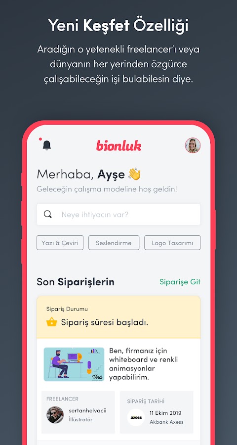 Bionluk; начинающих, особенно с небольшими бюджетами, компаний, которые не чувствуют себя готовыми или нуждаются в создании штатной команды для аренды офиса или не нуждающегося в нем, полностью или частично через Интернет; Это динамичная платформа, объединяющая быстрых и талантливых фрилансеров, работает с глобальным пониманием сообщества и, таким образом, включает возможности создания международной бизнес-сети.