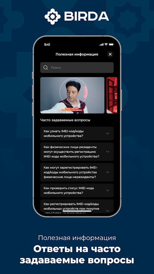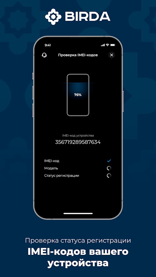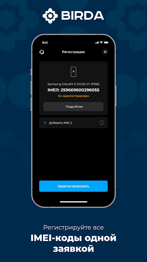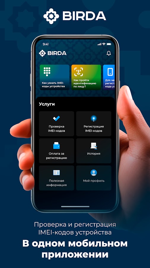 BIRDA — это быстрый способ зарегистрировать IMEI-код вашего телефона. Благодаря идентификации данных пользователя по лицу и сверке с паспортными данными, процесс регистрации стал простым, но надежным. Вам не нужно идти в офис регистратора или в почтовое отделение. Все можно сделать, не выходя из дома.