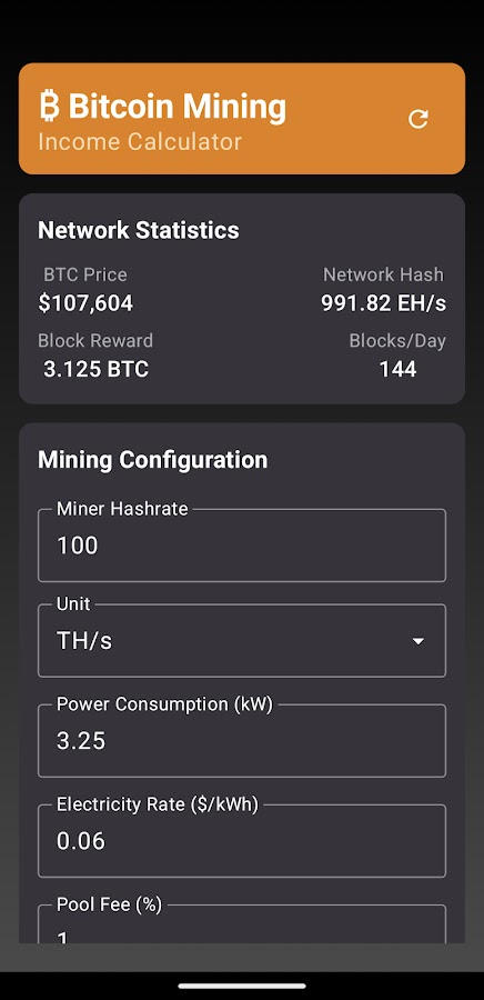 Красивый интерфейс Material Design в оранжево-черных тонах, отражающий культовый брендинг биткоина. Плавная анимация и интуитивно понятное управление упрощают расчеты майнинга.