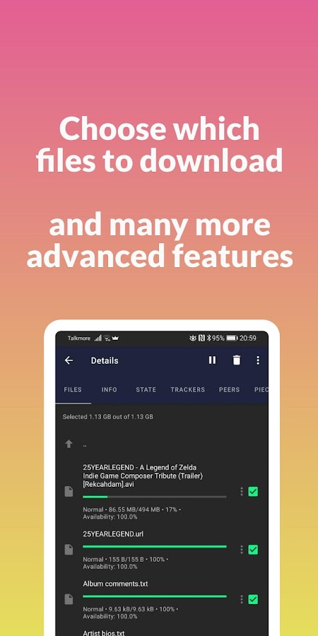 Потоковая передача видео и аудио торрентов (почти) мгновенно. Не нужно качать весь торрент. Отправляйте видео на Chromecast — даже во время потоковой передачи (требуется хорошее соединение)