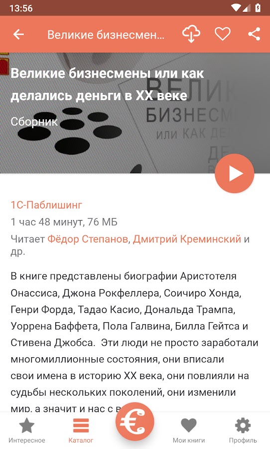 В приложении «Бизнес-книги» вы найдете огромную коллекцию аудио книг и радиоспектаклей зарубежных и отечественных авторов всех возможных жанров. В первую очередь, это масса интересных книг по саморазвитию и самосовершенствованию, книги для бизнеса, книги для юристов и материалы для изучения иностранных языков. Также в нашей коллекции присутствуют фантастика и триллеры, мистика и приключения, детективы и вечная классика, великолепная подборка аудиоспектаклей и сказок для детей.