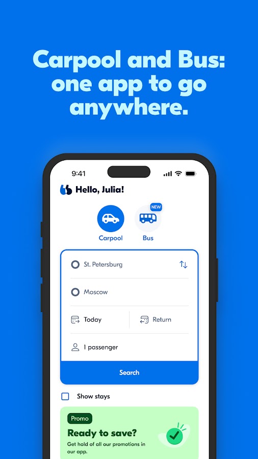 BlaBlaCar объединяет все способы междугородних поездок в одном приложении. Не нужно сравнивать цены на разных сайтах или договариваться о поездке в соцсетях. Всё происходит внутри приложения: