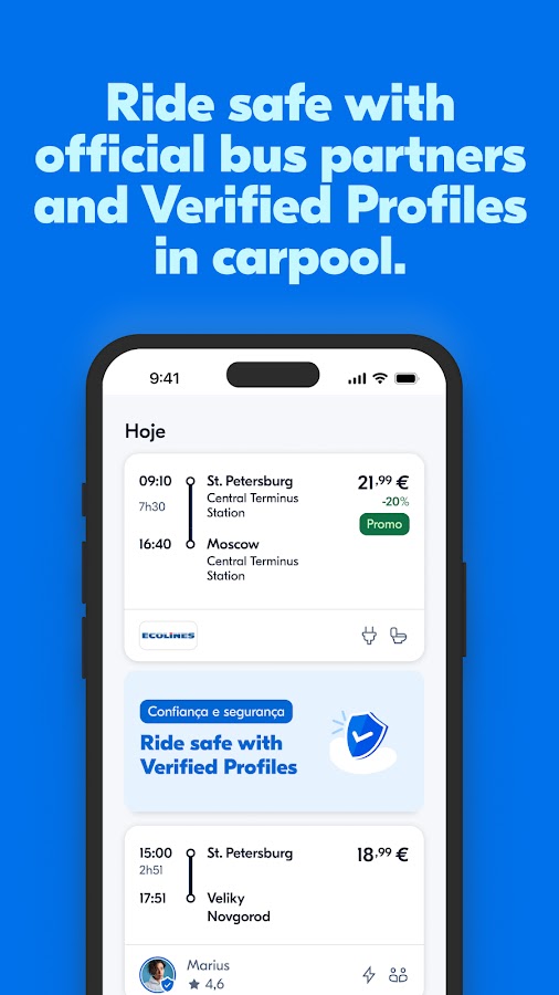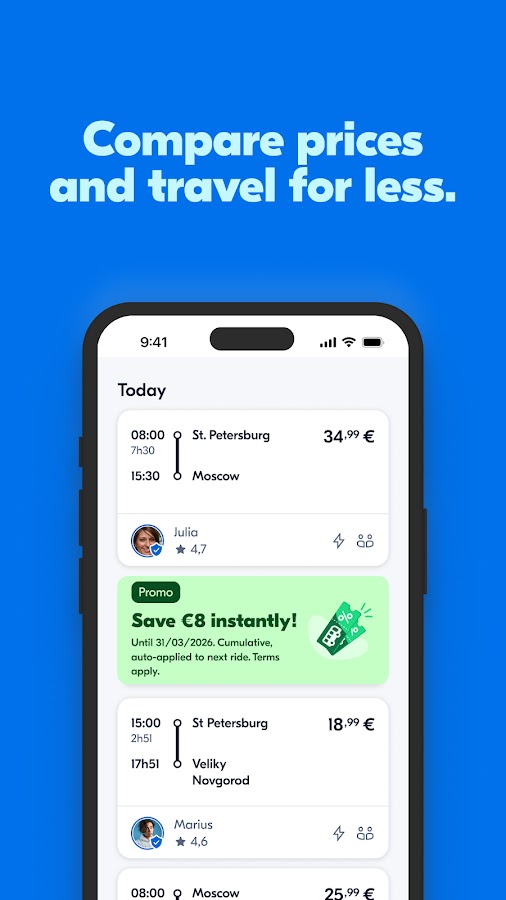 BlaBlaCar — это платформа для поиска попутчиков и бронирования автобусных билетов, которая помогает путешествовать дешевле и удобнее. Здесь можно найти машину до нужного города, опубликовать свободные места в своём автомобиле или сравнить цены на автобусы от официальных перевозчиков. Приложение работает по всей России, охватывает тысячи направлений и позволяет экономить на поездках, не жертвуя комфортом. Интерфейс простой, бронирование занимает пару минут, а каждый профиль проходит проверку через отзывы и рейтинги.