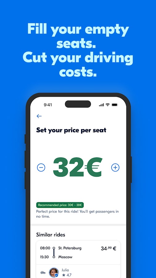 Скачайте BlaBlaCar для Android и получите доступ к тысячам попутчиков и автобусных билетов по всей России. Планируйте поездки в пару касаний, экономьте на топливе, выбирайте надёжных попутчиков и путешествуйте с комфортом. Для водителей — способ сократить расходы и сделать поездку неодинокой. Для пассажиров — удобный и безопасный способ добраться до места по цене ниже рыночной. Установите BlaBlaCar и откройте для себя новый уровень междугородних путешествий.