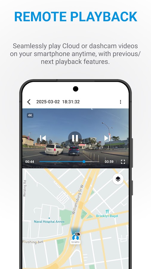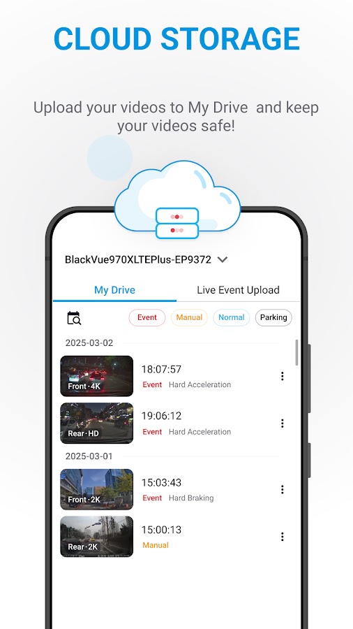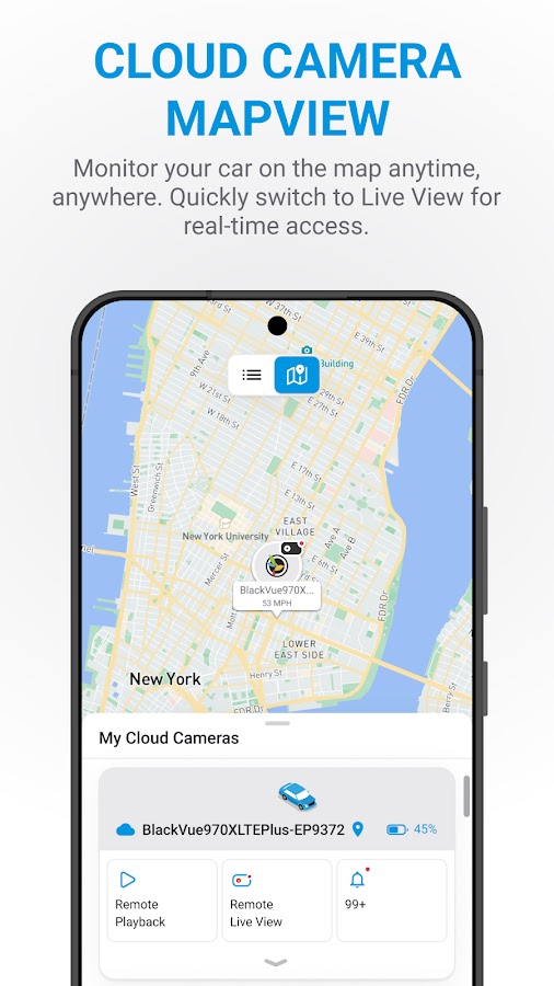 Используя мобильное или встроенное в автомобиль подключение к Интернету и видеорегистратор BlackVue, BlackVue Cloud подключает вас к вашему автомобилю через облако. Используя приложение BlackVue на своем смартфоне или планшете, вы в режиме реального времени видите, где находится ваш автомобиль и что происходит вокруг него.