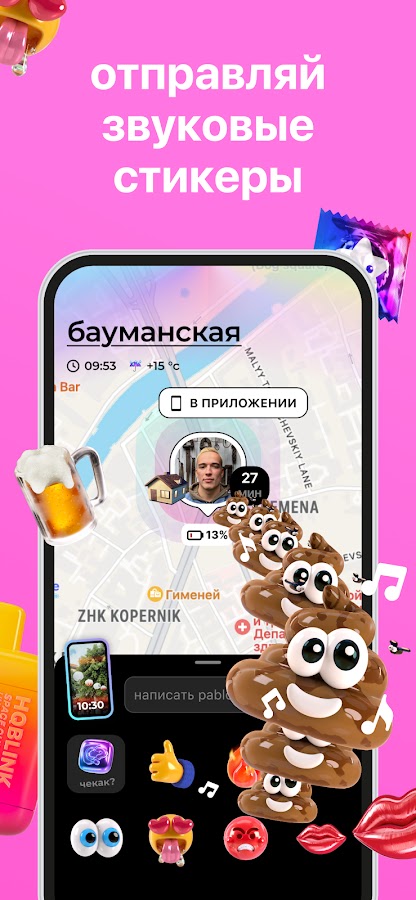 Интерактивная карта отображает реальное местоположение друзей, их заряд телефона и даже скорость передвижения! Мгновенная связь с близкими: мессенджер, голосовые звонки и звонки по видео, обмен геолокацией и жизненные стикеры с необычными звуками сделают переписку ещё ярче и веселее!