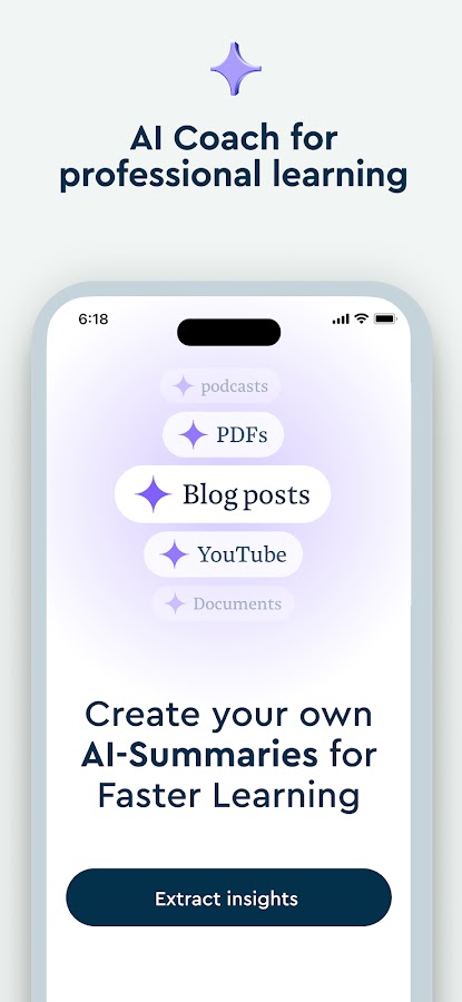 Хотите выйти за рамки книг? С Blinkist Pro вы можете составлять краткие содержания статей, PDF-файлов и видео всего за несколько секунд с помощью Blinkist AI. Да, это революция в обучении, и вы приглашены.