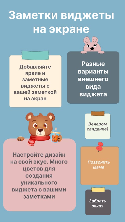 Удобное, современное приложение для создания заметок, коротких записей на экран вашего смартфона или планшета. Рецепты, мысли, события, планы, список дел, расписание занятий, пожелания себе на следующий день или напоминание купить подарок подруге, записывайте все, что нужно в наш милый блокнот — заметки. Виджет с заметкой на экран это легко и удобно. Добавить яркую и оригинальную заметку на рабочий стол устройства за несколько кликов. Настройте дизайн под свой вкус. Большое количество цветов для создания неповторимого виджета с вашей заметкой. Создайте стикер наклейку с вашими заметками и не забудете о предстоящих событиях, планах или списке дел. Варианты настройки: