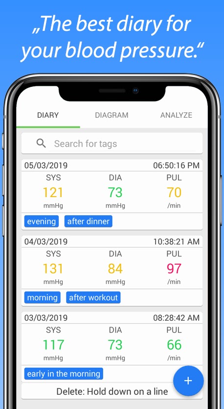 Этот обширный дневник артериального давления предоставляет вам все функции, необходимые для записи, отслеживания и анализа вашего артериального давления и пульса.
