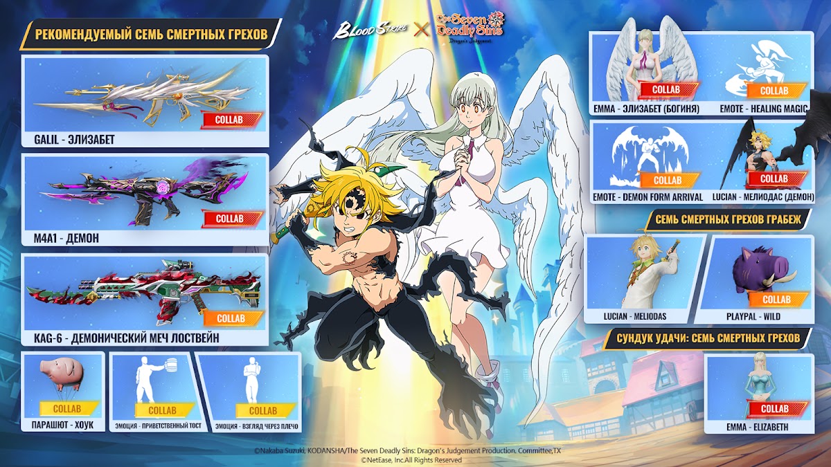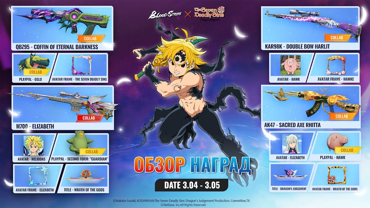 С 4/3 по 5/3 участвуйте в режиме и событиях The Seven Deadly Sins, чтобы бесплатно получить несколько эксклюзивных скинов коллаборации.