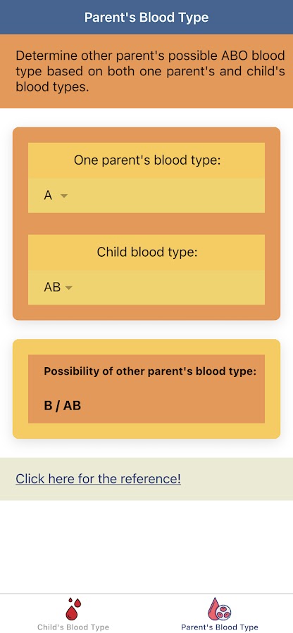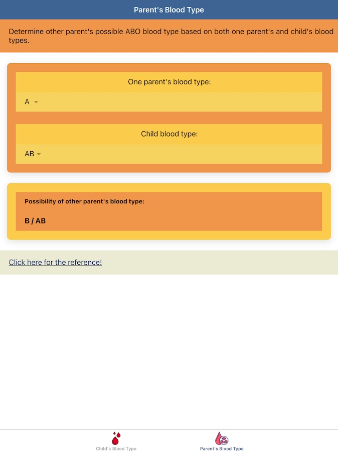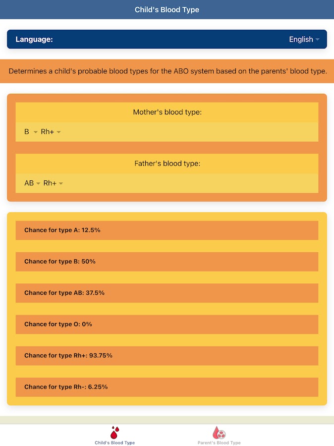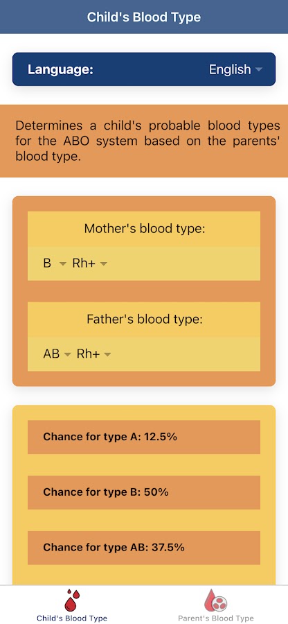 «Калькулятор Группы Крови: ABO Вероятность Крови» — это приложение, разработанное, чтобы помочь пользователю определить вероятность группы крови своих детей, если пользователь знает группу крови обоих родителей. Это будет полезно перед выполнением анализа крови для донора крови Красного Креста, потому что мы можем предвидеть нашу группу крови. «Калькулятор Группы Крови: ABO Вероятность Крови» также имеет функцию для определения возможности другой родительской группы крови, если известна группа крови одного из родителей и детей. Если вы знаете свою группу крови, вы также можете узнать свою диету по группе крови и правильно питаться в соответствии с вашей группой крови.