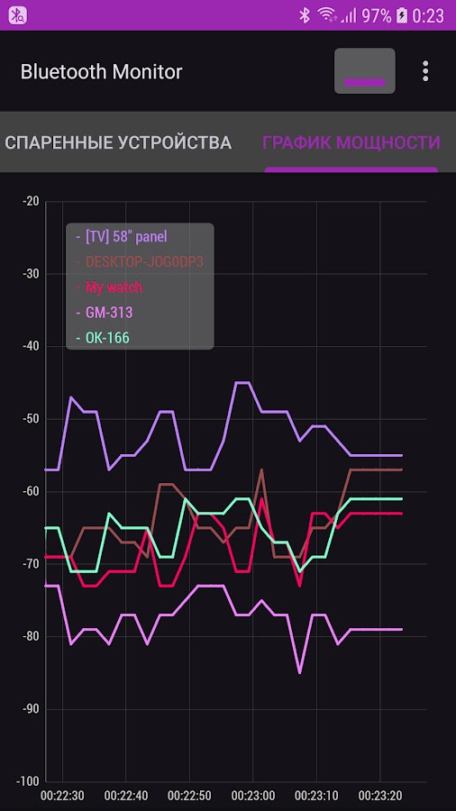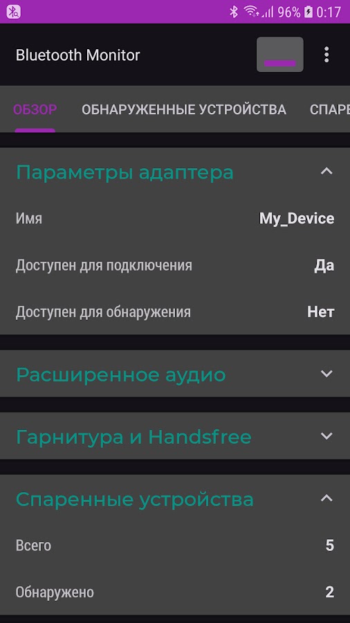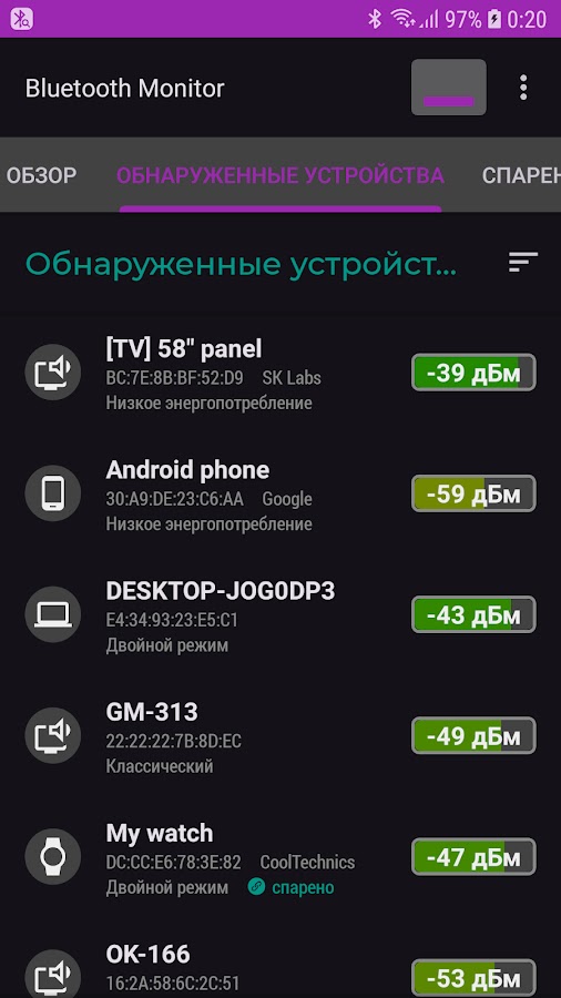 На вкладке «Обнаруженные устройства» находится результат сканирования окружения Bluetooth в виде обновляемого списка.