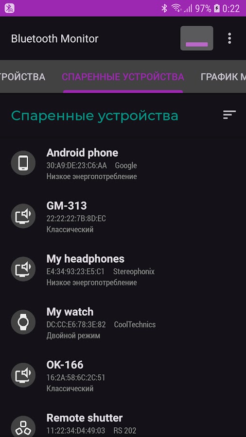 Bluetooth Monitor поможет узнать, какие устройства Bluetooth находятся рядом и какие из них подключены. Кроме того приложение отображает список спаренных (сопряжённых) устройств.