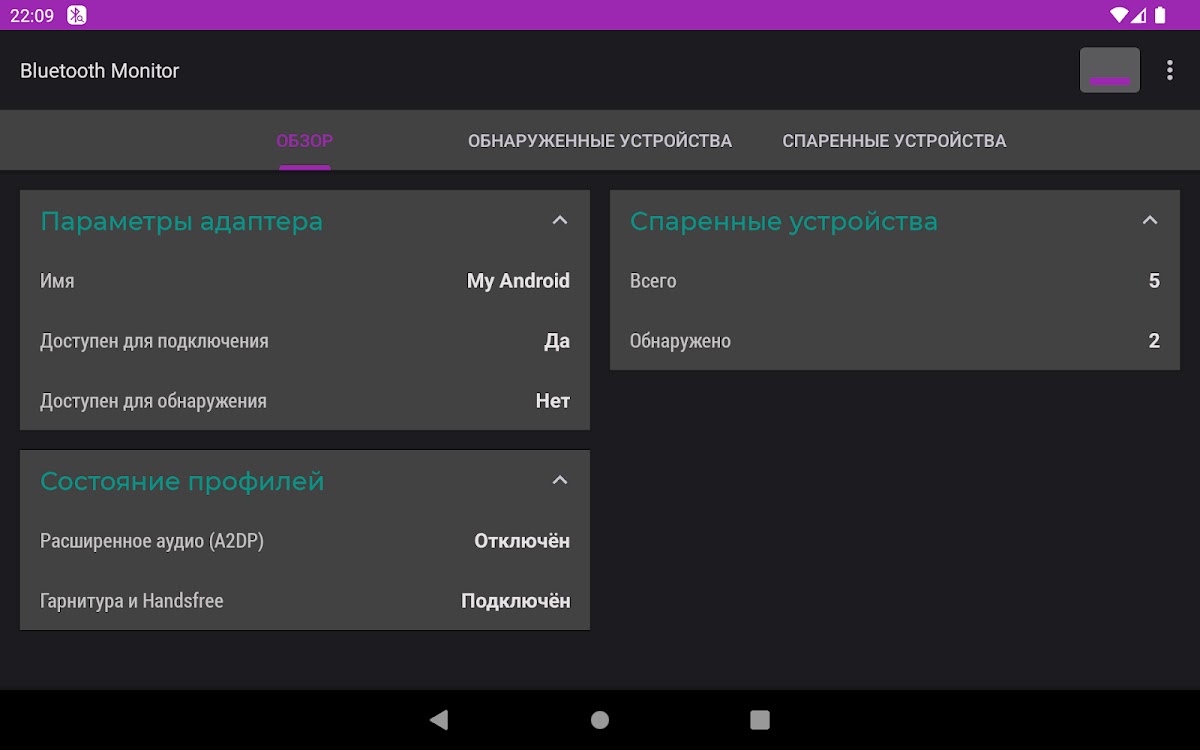 Вкладка «Обзор» содержит основную информацию о Bluetooth-адаптере, состоянии профилей гарнитуры и подключённых аудиоустройств, количестве спаренной аппаратуры.