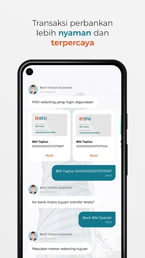 Aplikasi BNI Вызовите виртуального помощника, используя контакт-центр с искусственным интеллектом (AI). Dilengkapi fitur perintah suara (Голосовое управление) berbahasa Indonesia, dengan suara yang dikeluarkan memakai Голосовые запросы и обработка естественного языка (NLP) selayaknya kamu berbicara dengan bestie-mu.