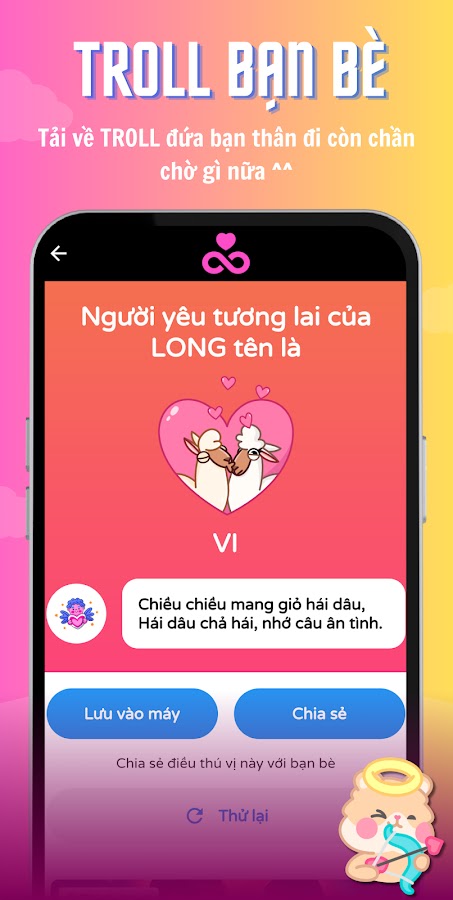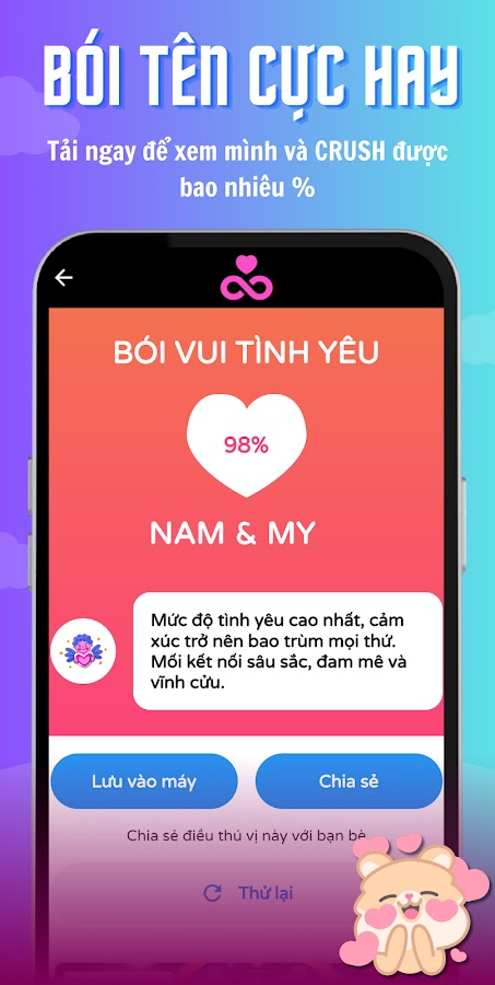 Скачайте приложение Bói Tình Yêu Theo Tên LoveTest для Android бесплатно - последняя версия (2.0.2) уже доступна для установки на ваш телефон или планшет.