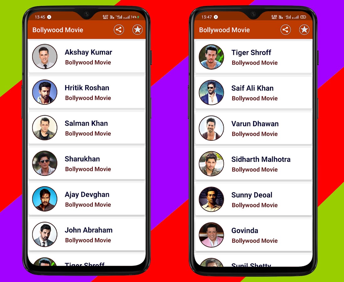 Приложение «Кино на хинди» содержит фильм Амитаба Баччана, фильм Салмана Кхана, фильм Сахрукх Кхана, фильм Аамира Кхана, фильм Акшая Кумара, фильм Санджая Датта, фильм Аджая Девгана, фильм Насируддина Шаха, фильм Анила Капура, фильм Наны Патекар, фильм Санни Деола, фильм Боби Деола, фильм Митхуна Чакраварти, фильм Риши Капура, фильм Ранбира Капура, фильм Саифа Али Кхана, фильм Ритика Рошана, фильм Говинды, фильм Тигара Шроффа, фильм Джеки Шроффа, фильм Сунила Шетти, фильм Эмрана Хашми, фильм Ирфана Кхана, фильм Навазуддина Сиддуки, фильм Аршада Варси, фильм Абхая Деола, фильм Фархана Ахтара, фильм Сурханта Сингха Раджпута, фильм Арджуна Рампала, фильм Рандипа Худы, фильм Абхишека Баччана, фильм Арджуна Капура, фильм Имрана Кхана, фильм Джона Ибрагима, фильм Маноджа Баджпаи, фильм Сихида Капура, а также многие другие.